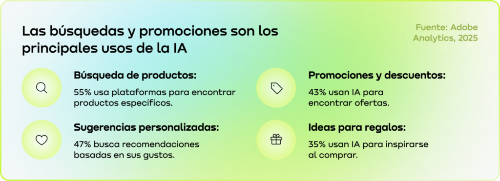Desde chatbots hasta asistentes virtuales, este canal se ha vuelto común. De hecho, 39% de los encuestados por Adobe ya han usado chatbots con IA para comprar, y 53% planean hacerlo este año.
