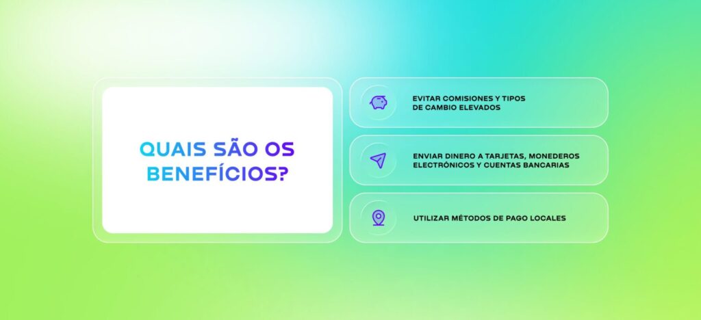• Flexibilidad total en transferencias. Simplifica los pagos internacionales a través de una plataforma unificada que envía fondos a tarjetas, billeteras digitales y cuentas bancarias de forma masiva, ahorrando tiempo y recursos.