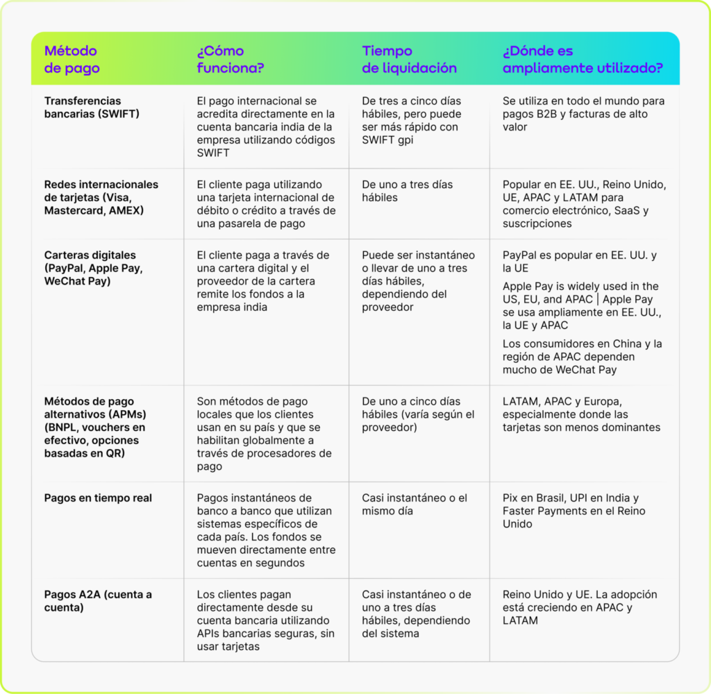 Luego, utilice esta tabla de los métodos de pago más comunes utilizados para aceptar pagos internacionales en India.