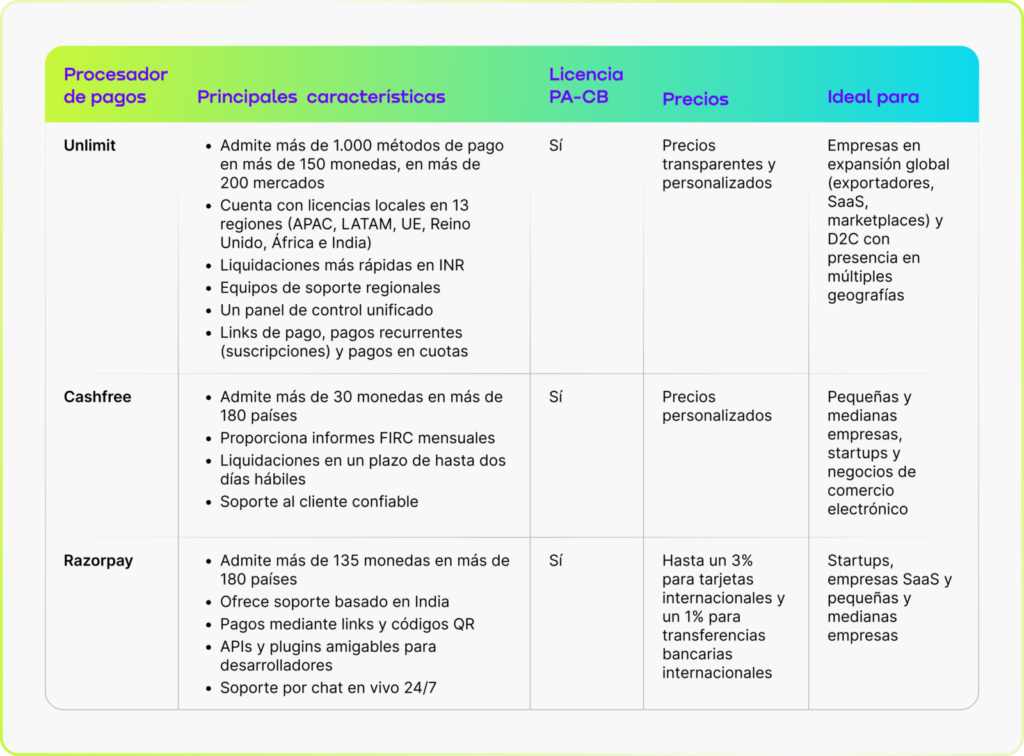 Además, las empresas deben asegurarse de que el procesador de pagos global posea las licencias apropiadas, como la licencia de Agregador de Pagos y Pasarela de Pago (PA-PG) y la licencia de Agregador de Pagos Transfronterizos (PA-CB) del RBI, para garantizar la efectividad de las operaciones domésticas e internacionales.