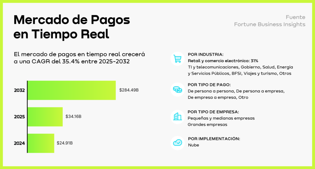 Fortune Business Insights valoró el mercado global de pagos inmediatos en 24,910 millones de USD en 2024, con expectativas de crecimiento de casi 10,000 millones de USD en 2025, llegando a un pronóstico de 284,490 millones de USD para 2032. Este crecimiento acelerado se debe a la creciente globalización del comercio.
