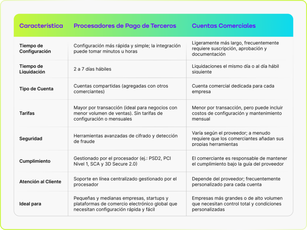 Aquí tienes una vista rápida de las principales diferencias entre procesadores de pago y proveedores de cuenta comercial.