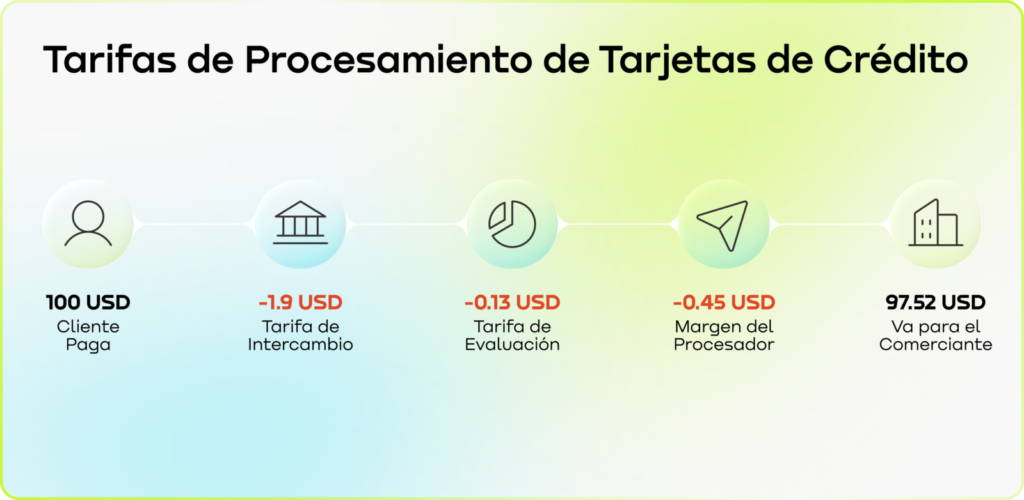 Para una compra de 100 USD, la tarifa de intercambio de 1.90 USD va al banco emisor, una tarifa de evaluación de 0.13 USD va a la red de tarjetas y un margen del procesador de 0.45 USD va al procesador de pagos. Así, las tarifas totales de procesamiento de la tarjeta de crédito son de 2.48 USD, y la empresa recibe 97.52 USD de una venta de 100 USD después de las tarifas.