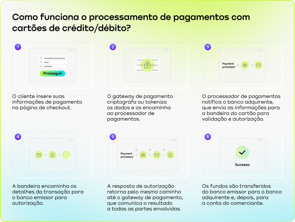 A maioria dos clientes globalmente escolhe pagar com cartões de crédito ou débito. Quando isso ocorre, entidades como gateways de pagamento, processadores de pagamento, bandeiras e bancos trabalham juntas para transferir o pagamento da conta bancária do cliente para a conta bancária do comerciante.