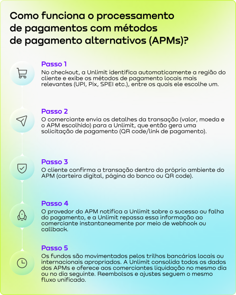 Ao contrário das transações com cartão, pagamentos feitos com APMs seguem um fluxo de processamento diferente. Aqui está uma visão simples em cinco etapas de como isso funciona na Unlimit.