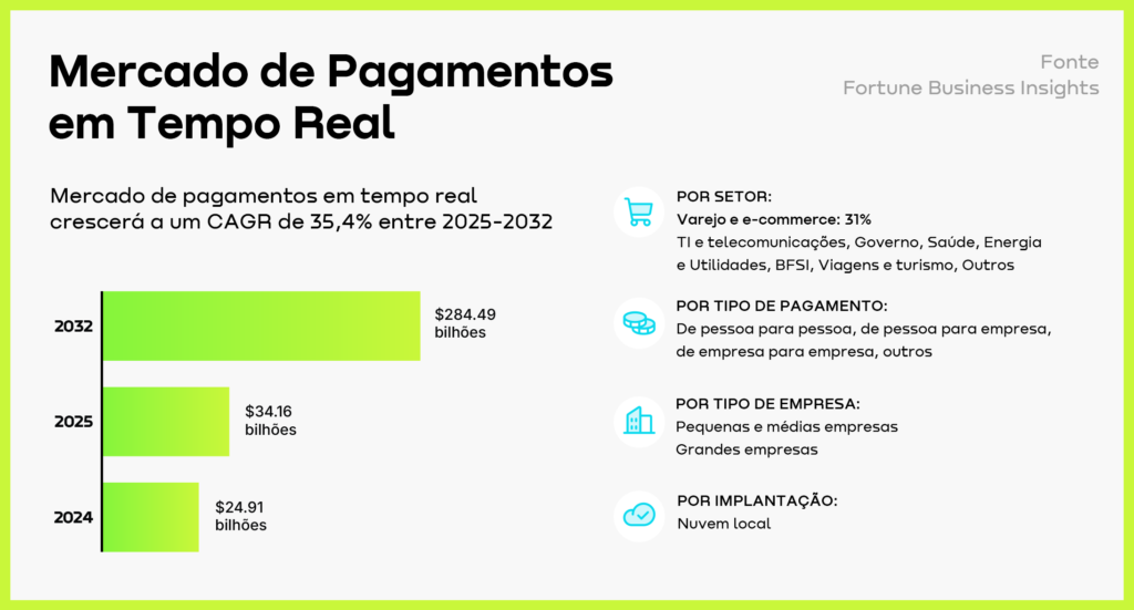 A Fortune Business Insights avaliou o mercado global de pagamentos instantâneos em US$ 24,91 bilhões em 2024, com expectativa de crescimento de quase US$ 10 bilhões em 2025, chegando a uma previsão de US$ 284,49 bilhões até 2032. Seu crescimento acelerado decorre da crescente globalização do comércio. As empresas, independentemente do tamanho, agora operam em um mundo mais interconectado, onde a capacidade de enviar e receber pagamentos rapidamente entre fronteiras é fundamental. Isso levou ao desenvolvimento de redes internacionais de pagamento instantâneos, permitindo transações fluidas que atendem tanto a consumidores quanto a empresas envolvidas no comércio cross border. Como resultado, o cenário das transações financeiras está evoluindo – seja para agilizar transações de e-commerce ou pagamentos para trabalhadores autônomos –, e os sistemas de pagamento instantâneo estão na vanguarda dessa transformação.