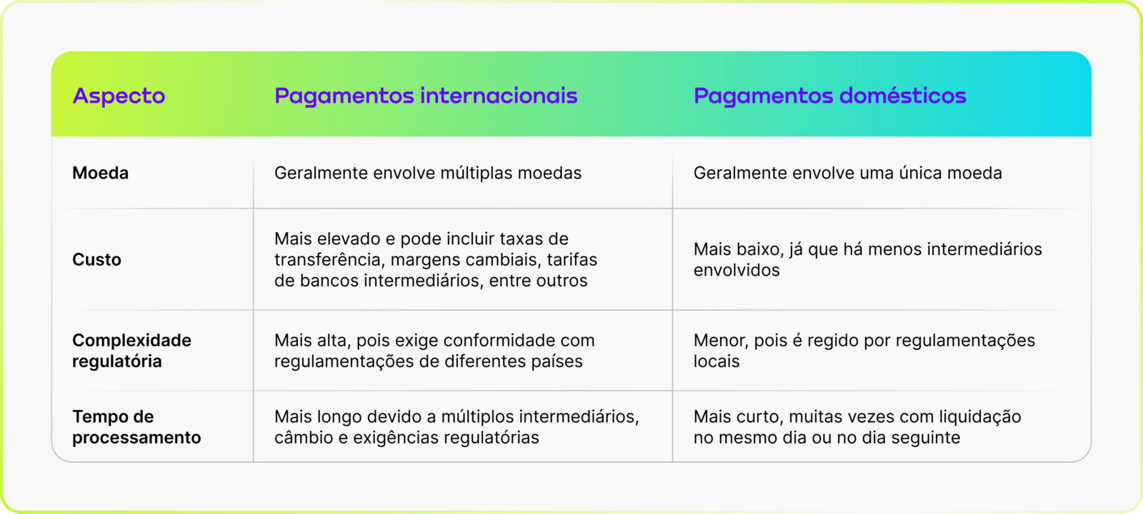 Apesar dessas diferenças, os pagamentos internacionais são essenciais porque permitem que as empresas aproveitem oportunidades além de seu mercado local, seja uma base de consumidores mais ampla ou um pool de talentos altamente qualificado.
