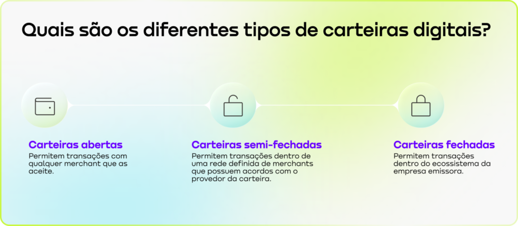 • Carteiras abertas (Open wallets): permitem transações para qualquer comerciante que as aceite. O cliente as usa para compras online, pagamentos por aproximação em lojas físicas, transferências entre pares e saques em caixas eletrônicos