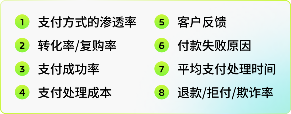 上述提到的内容有很多,要一次到位的确有难度,所以我们应该把重心放在如何搜集和跟踪数据以达到持续地改进、优化上。以下是一些十分有用的矩阵,这些数据可以反应支付处理的健康程度,是否存在根本性的问题需要解决。